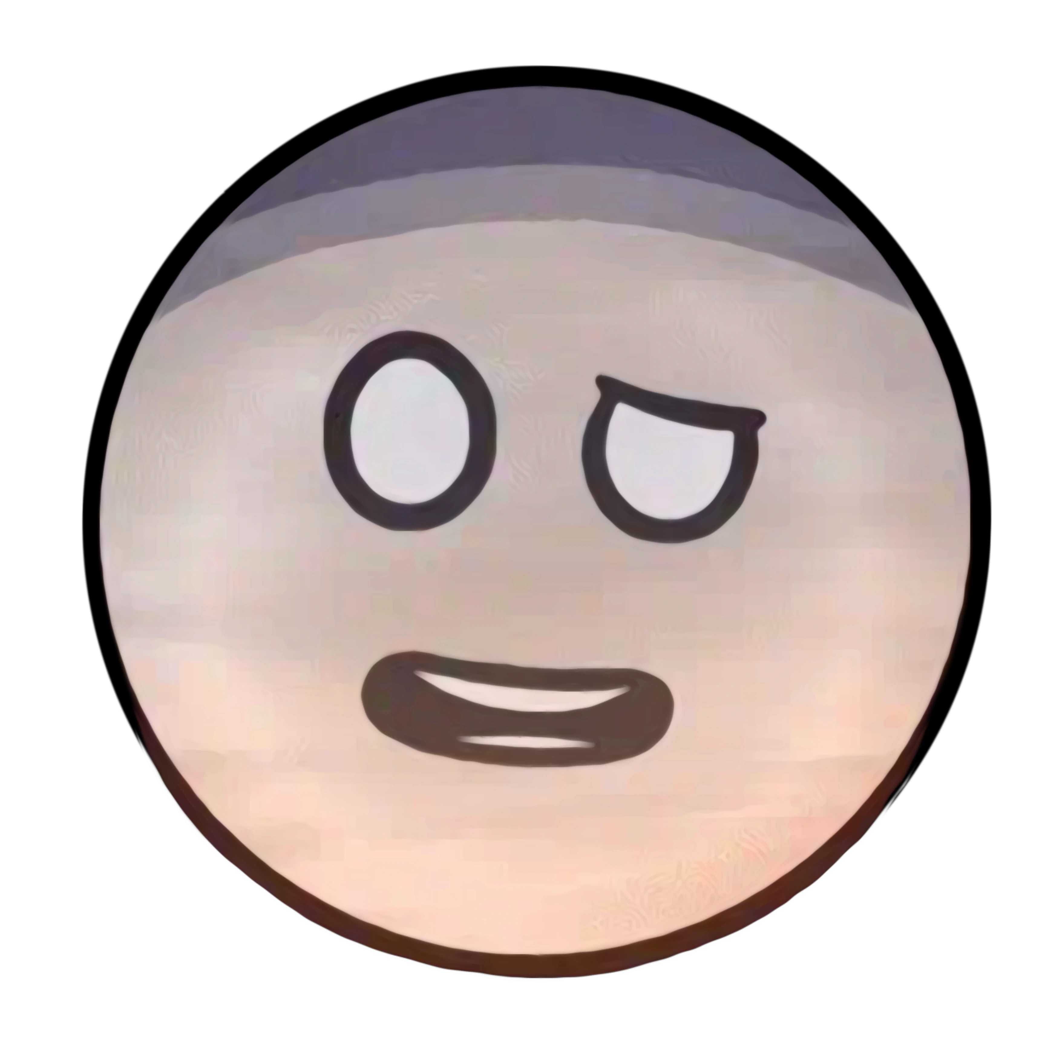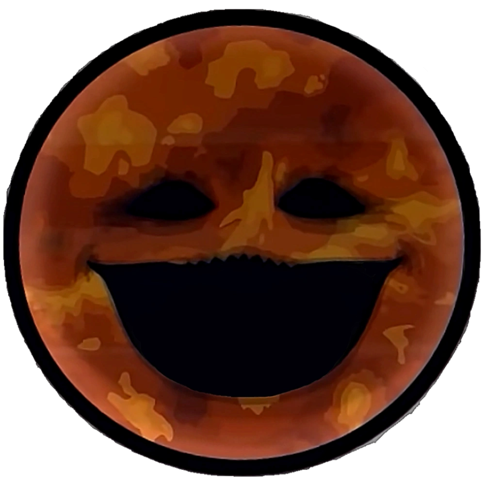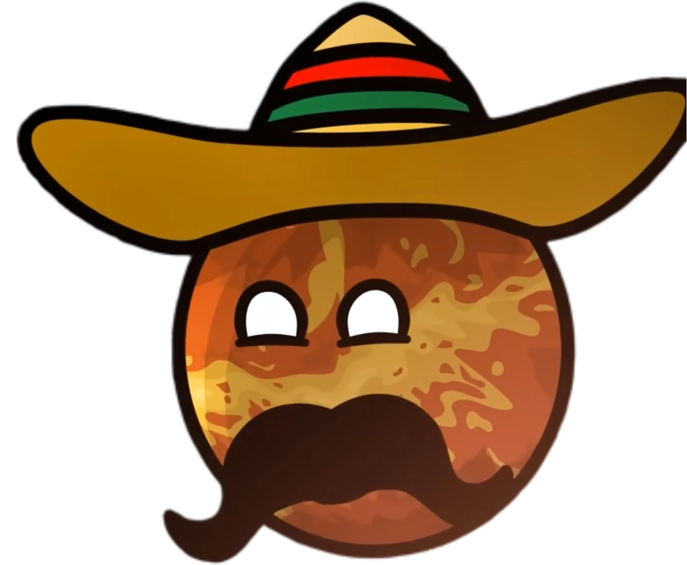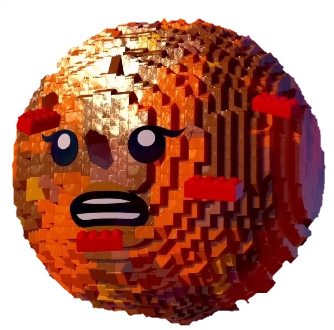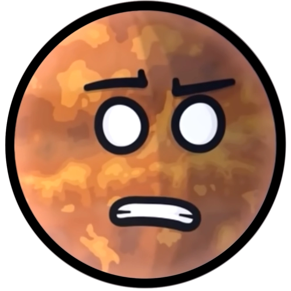 Venus is an orange-red sphere with yellow stripes on his equator, representing his surface. He has two equally-sized eyes and they are much on top from the mouth.
